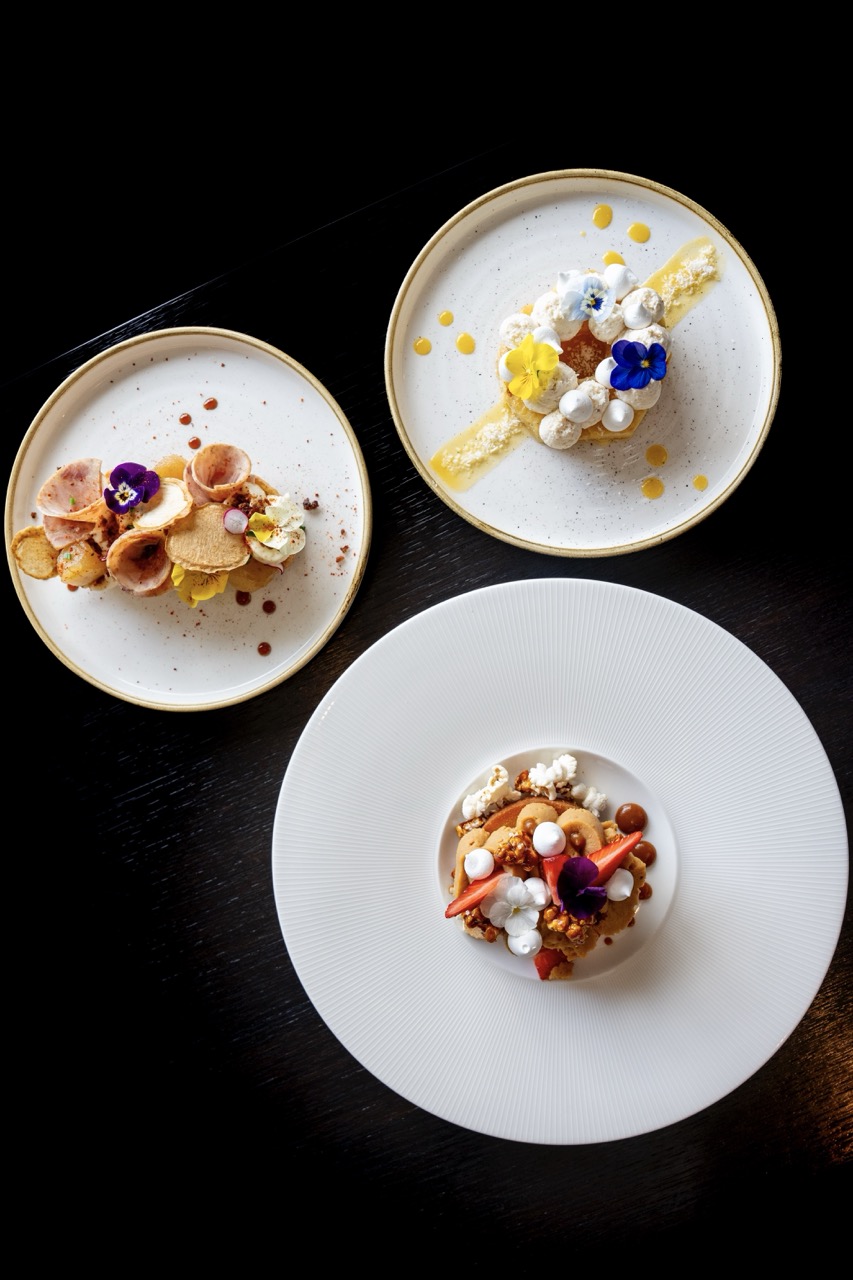 Mi-cuit au chocolat Valrhona et sa glace vanille ; Tarte Tatin & sa crème fraîche d’Isigny ; Crème enflammée ; Ile flottante coco & mango ; La Fallue Normande ; Coupe 3 boules ; Coupe glacée Normande